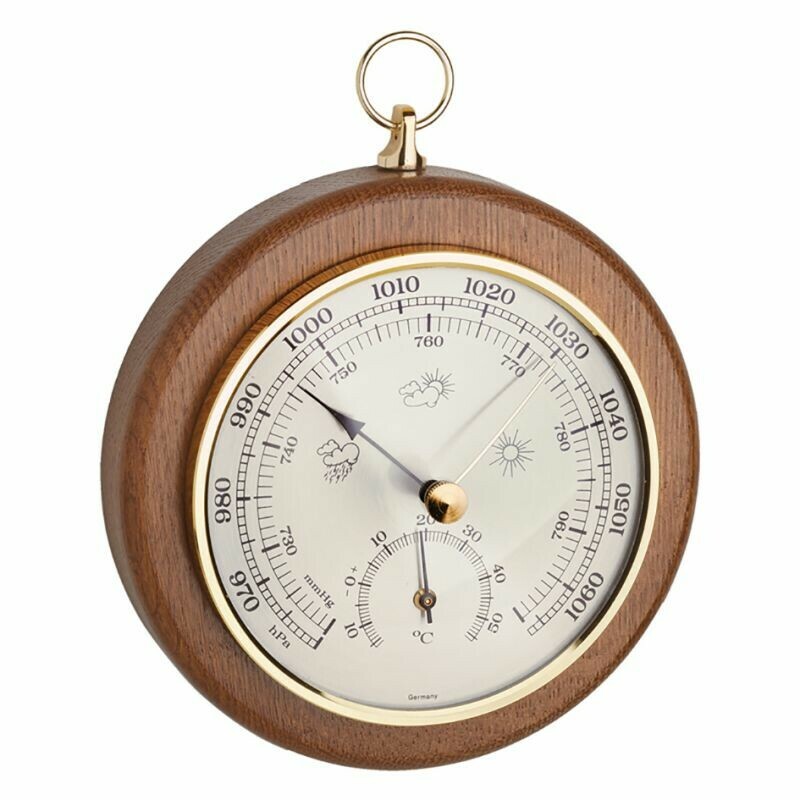 En bois de chêne et laiton doré, ce baromètre sera du plus bel effet dans votre intérieur.
