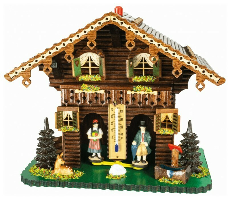 Le mécanisme repose sur un fil en boyau naturel situé à l'intérieur du chalet, matériau sensible aux variations hygrométriques ambiantes. Lorsque l'humidité atmosphérique fluctue, ce fil se contracte ou se dilate, générant un mouvement de rotation qui actionne le système de figurines. Par temps sec, le personnage féminin sort de l'habitacle, tandis que l'augmentation de l'humidité déclenche l'apparition du personnage masculin, créant ainsi un baromètre vivant et décoratif.