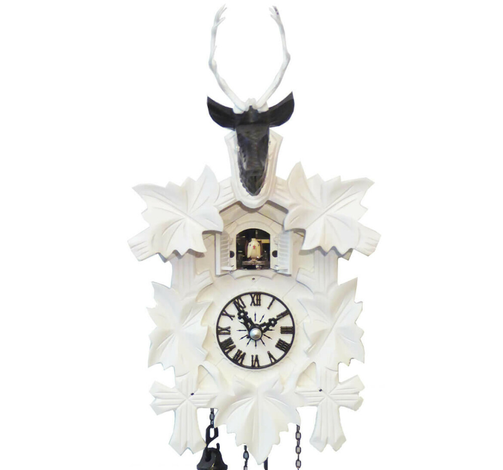 Vous serez charmés par son animation : quand le coucou sonne le nombre de coups à l'heure, la porte au-dessus du cadran s'ouvre. Les poids ont un but esthétique, pas besoin de les remonter.
