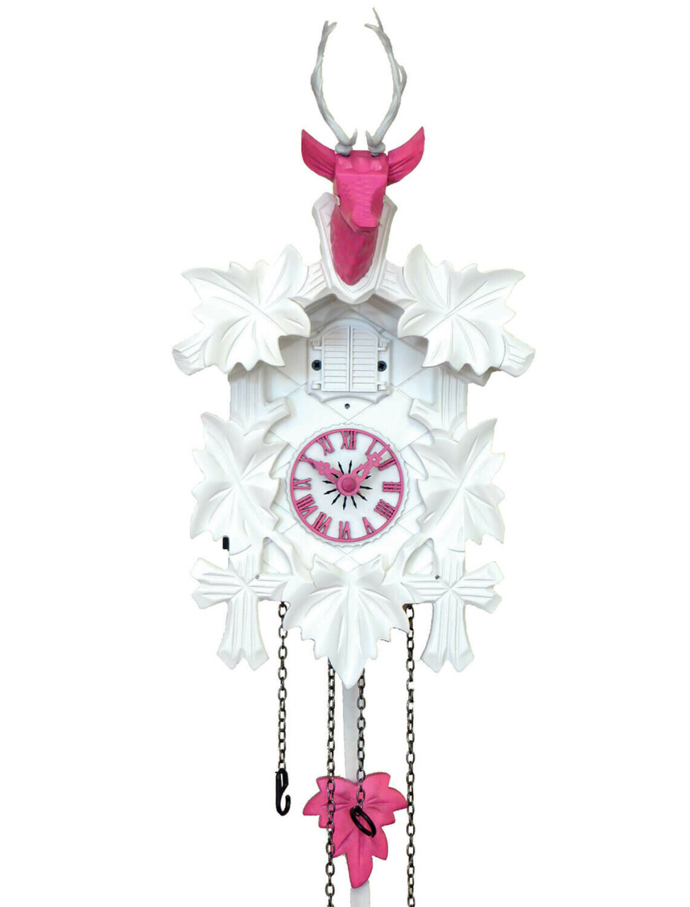 Vous serez charmés par son animation : quand le coucou sonne le nombre de coups à l'heure, la porte au-dessus du cadran s'ouvre. Les poids ont un but esthétique, pas besoin de les remonter.