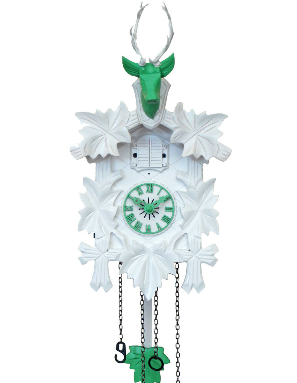 Vous serez charmés par son animation : quand le coucou sonne le nombre de coups à l'heure, la porte au-dessus du cadran s'ouvre. Les poids ont un but esthétique, pas besoin de les remonter.