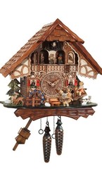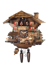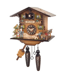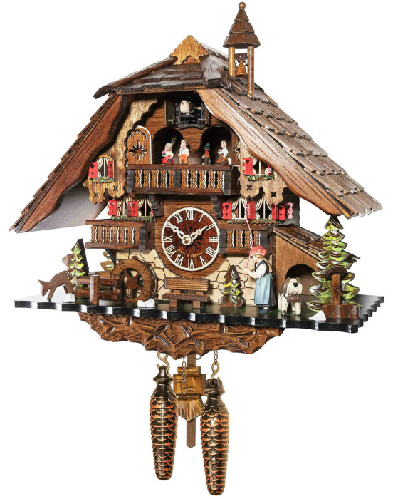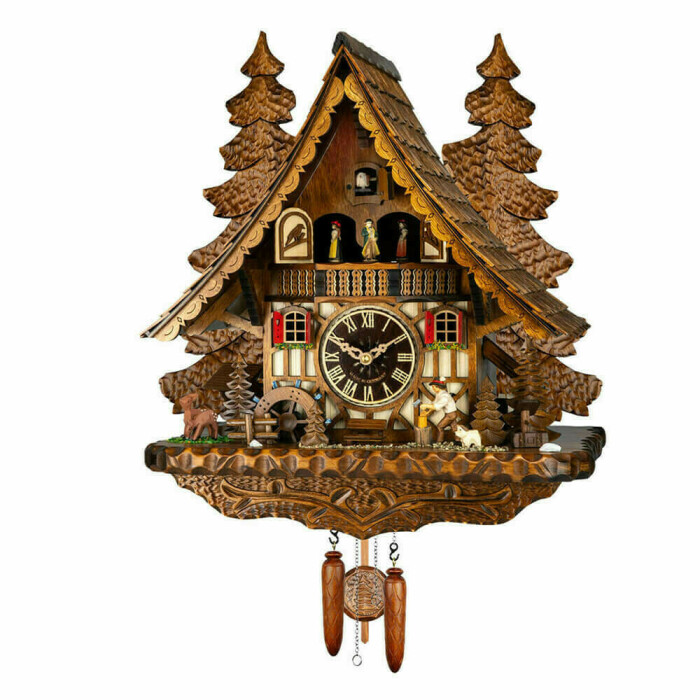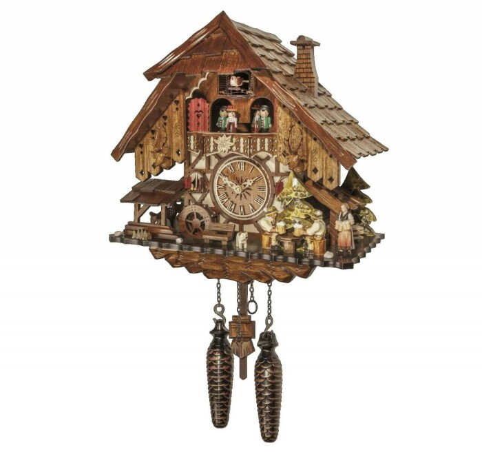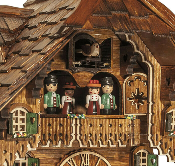 Véritable coucou de la Forêt Noire, réalisé en bois de tilleul et équipé d'un mouvement à quartz, pendant l'animation, les 4 couples de danseurs en haut s'animeront.