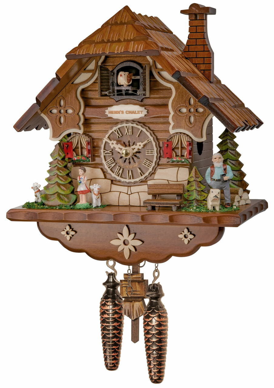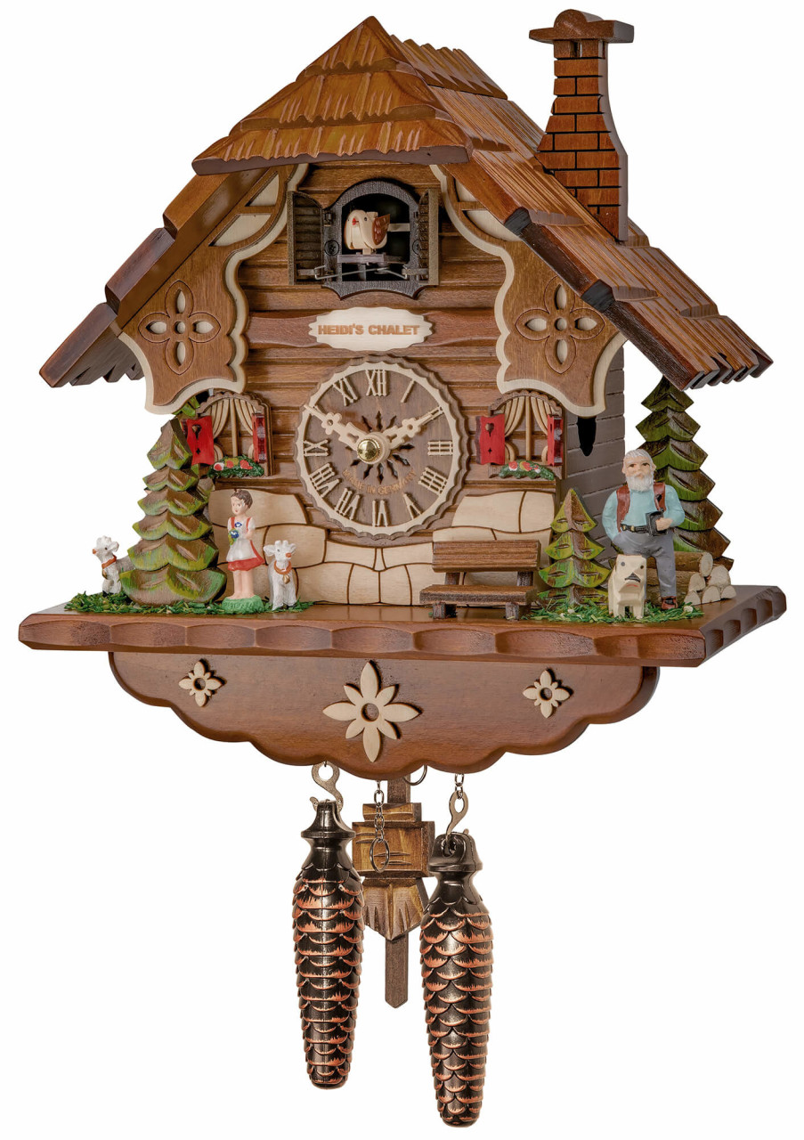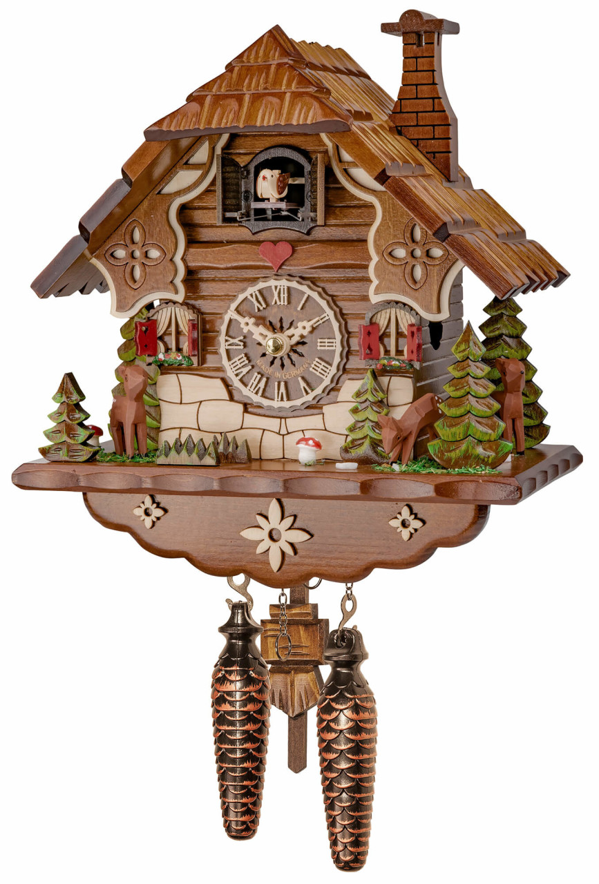 Véritable coucou de la Forêt Noire, réalisé en bois de tilleul et équipé d'un mouvement à piles. De fabrication artisanale, les sculptures sont exécutées à la main. Quand le coucou chante à l'heure pleine, la porte qui est au-dessus du cadran, s'ouvre.