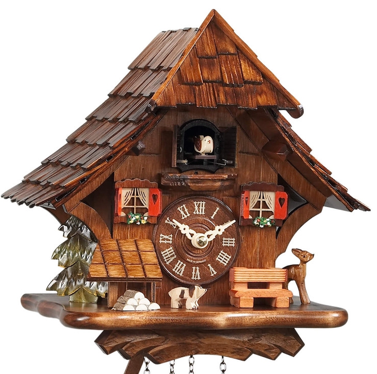 Ce coucou traditionnel de la Forêt Noire a été réalisé en bois de tilleul. Son chant du coucou retentira après la sortie de l'oiseau et laissera place à une jolie mélodie d'écho de la forêt. Sculptures réalisées à la main, les décors sont inspirés des maisons des chefs de gare.