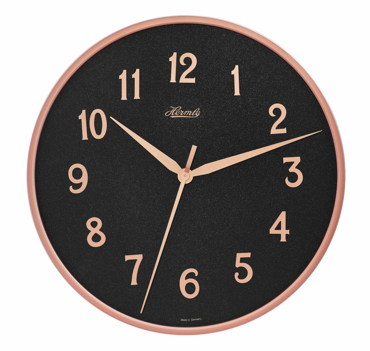 Avec son cadran noir et métal cuivré, cette horloge moderne et élégante rehaussera la décoration de votre séjour. Les aiguilles et l'entourage assortis couleur cuivrée montre l'exécution délicate et recherchée par la manufacture Hermlé.