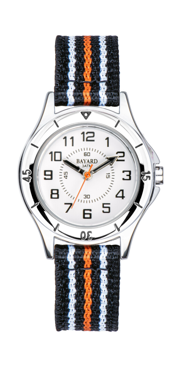 Cette montre Bayard spécialement conçue pour les adolescents garçons allie robustesse et style sportif. Le boîtier en acier avec lunette crantée résiste aux chocs du quotidien, tandis que l'étanchéité 3ATM permet les activités aquatiques légères sans crainte (résistant aux éclaboussures).
