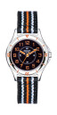 Le bracelet textile type NATO offre un confort optimal et une résistance remarquable. Trois combinaisons de couleurs dynamisent le design : noir et orange énergique, tricolore bleu-blanc-rouge patriotique, ou noir-blanc-orange moderne. Chaque version coordonne parfaitement les index, aiguilles et détails colorés.