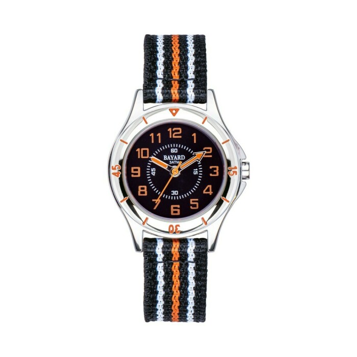 Cette montre Bayard révolutionne l'apprentissage horaire avec son cadran pédagogique unique affichant simultanément les formats 12h et 24h. Les chiffres multicolores facilitent la transition vers l'horlogerie adulte : chiffres colorés pour les heures classiques, graduation 24h en cadran intérieur.