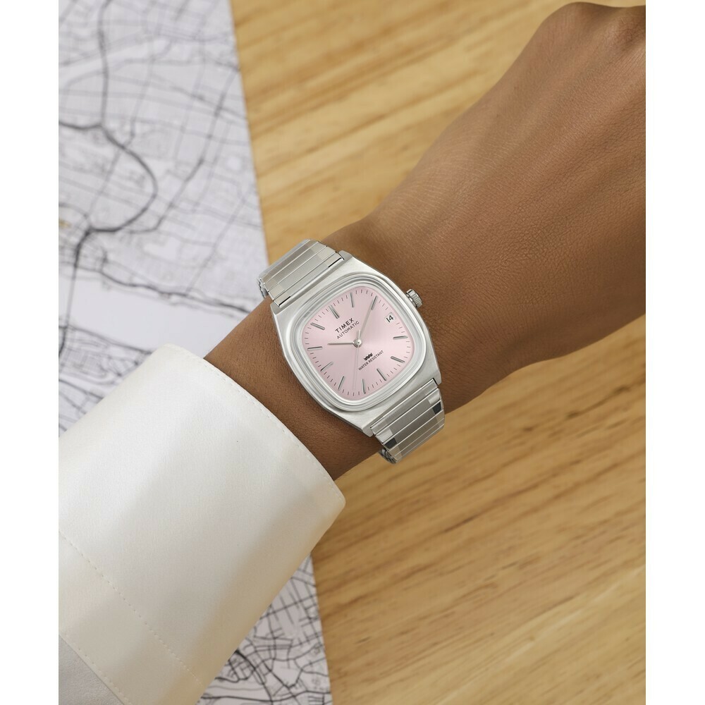 Cette montre Timex se distingue par son esthétique puisée dans les archives horlogères des années 80. Son boîtier "coussin" en acier inoxydable présente des finitions brossées et polies qui capturent la lumière avec subtilité. Le véritable point d'orgue de ce modèle est son cadran rose saumoné au fini soleillé, offrant une alternative chromatique audacieuse et élégante aux coloris traditionnels. Les index appliqués et les aiguilles bâtons assurent une lisibilité optimale, complétée par un guichet date discrètement positionné à 3 heures.