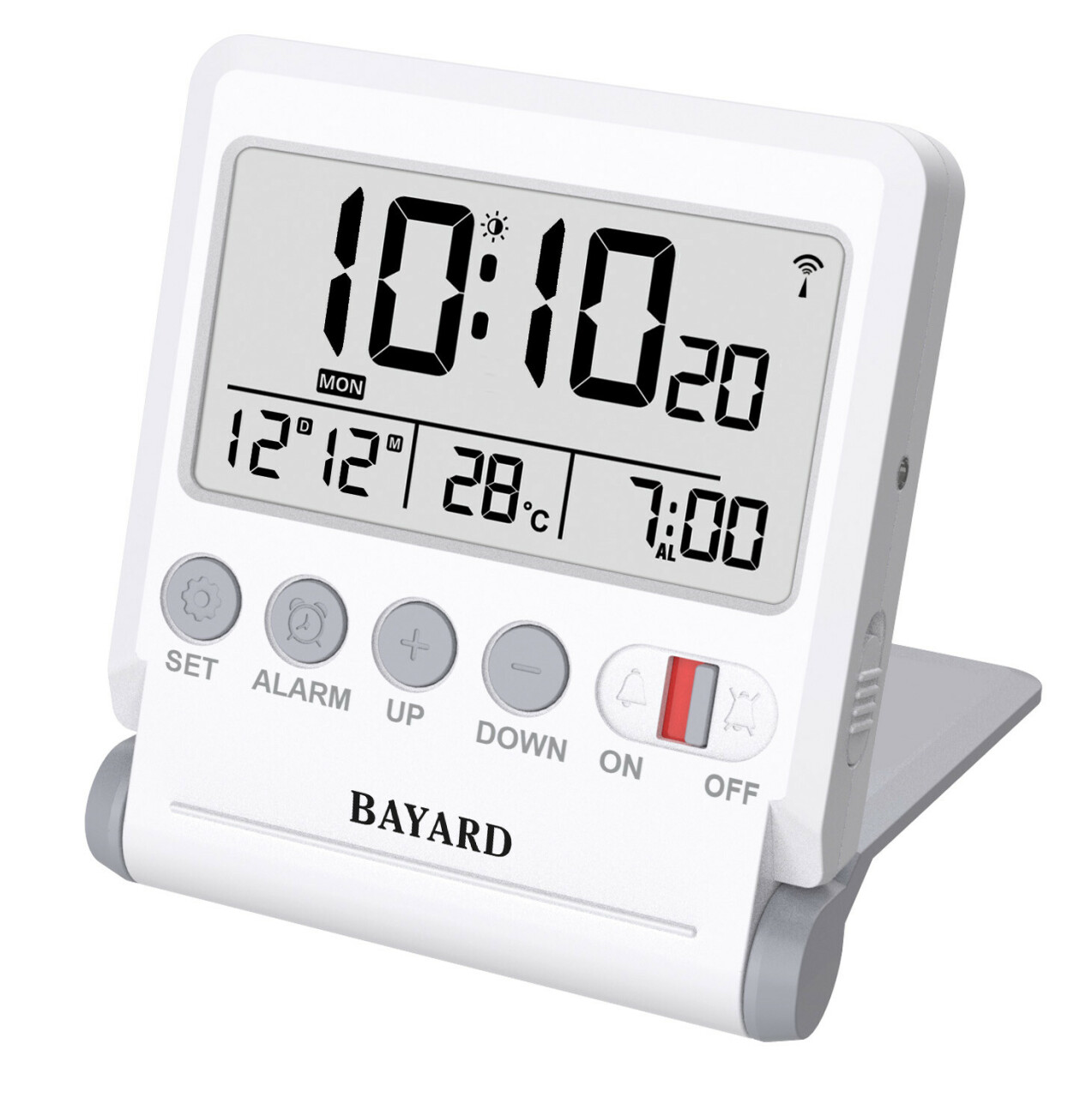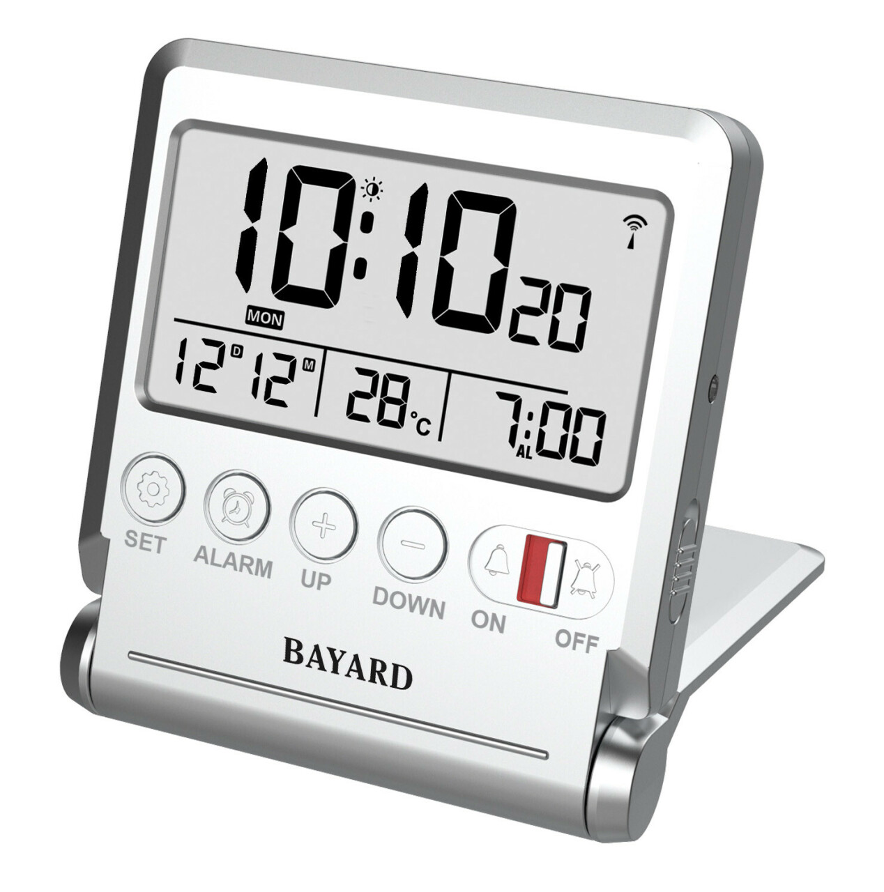 Ce réveil de voyage Bayard ultra-compact combine technologie et praticité dans un format pliable.